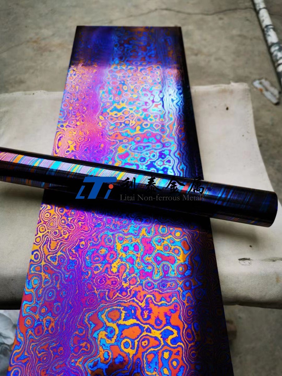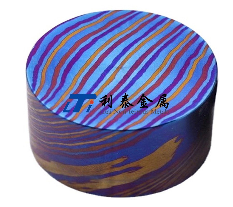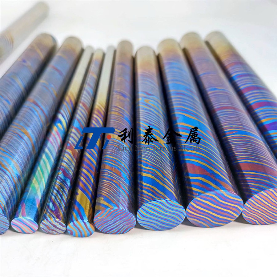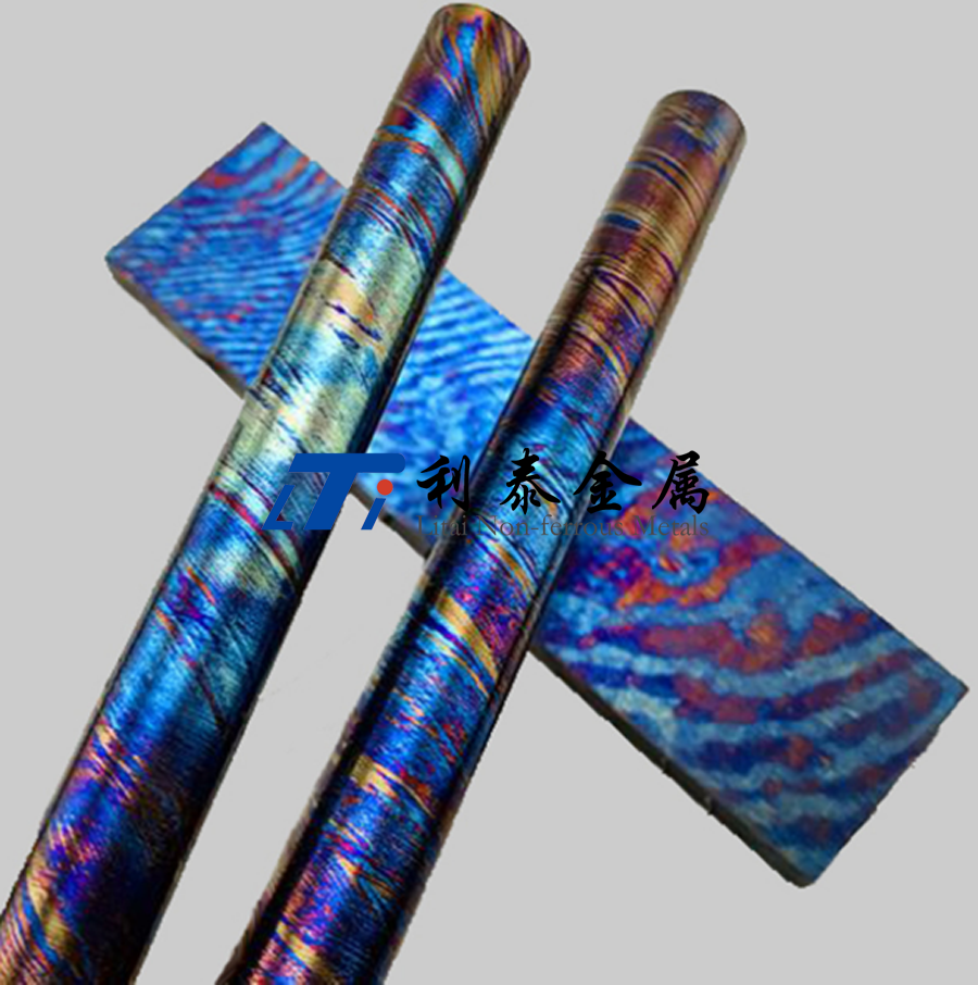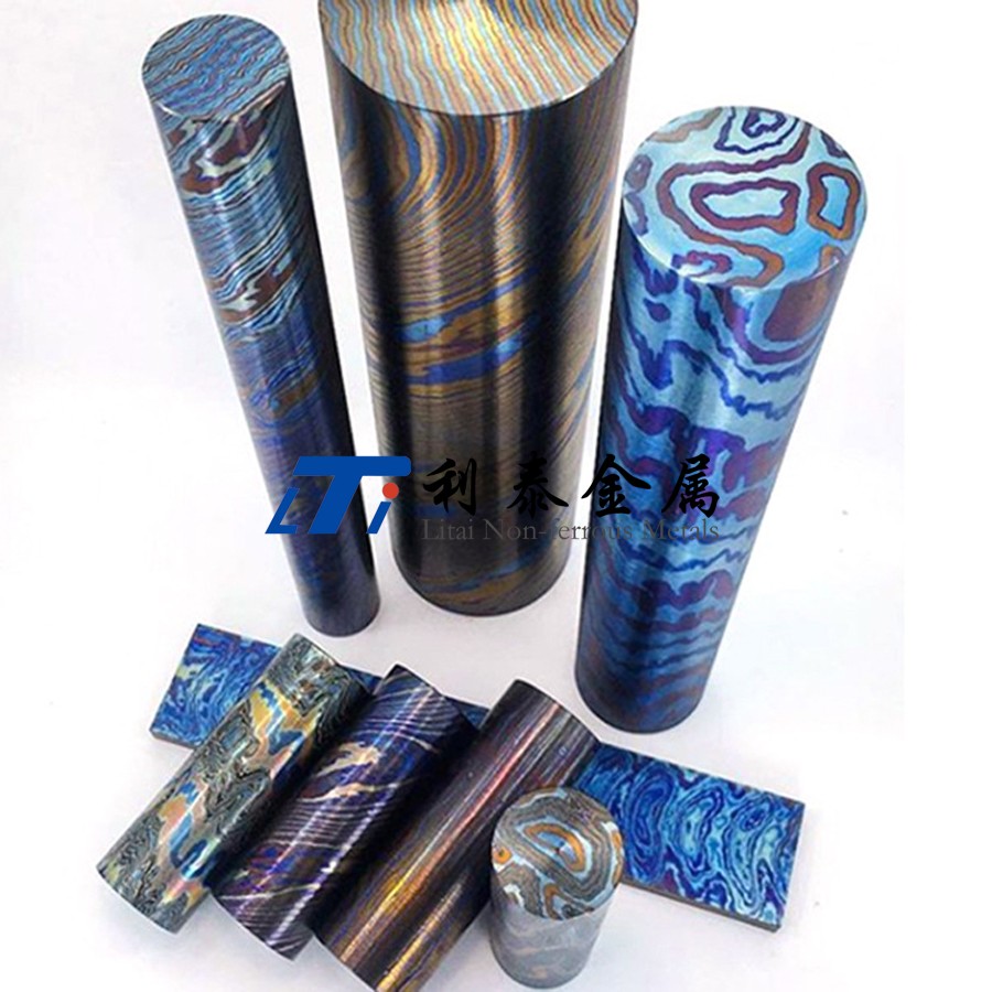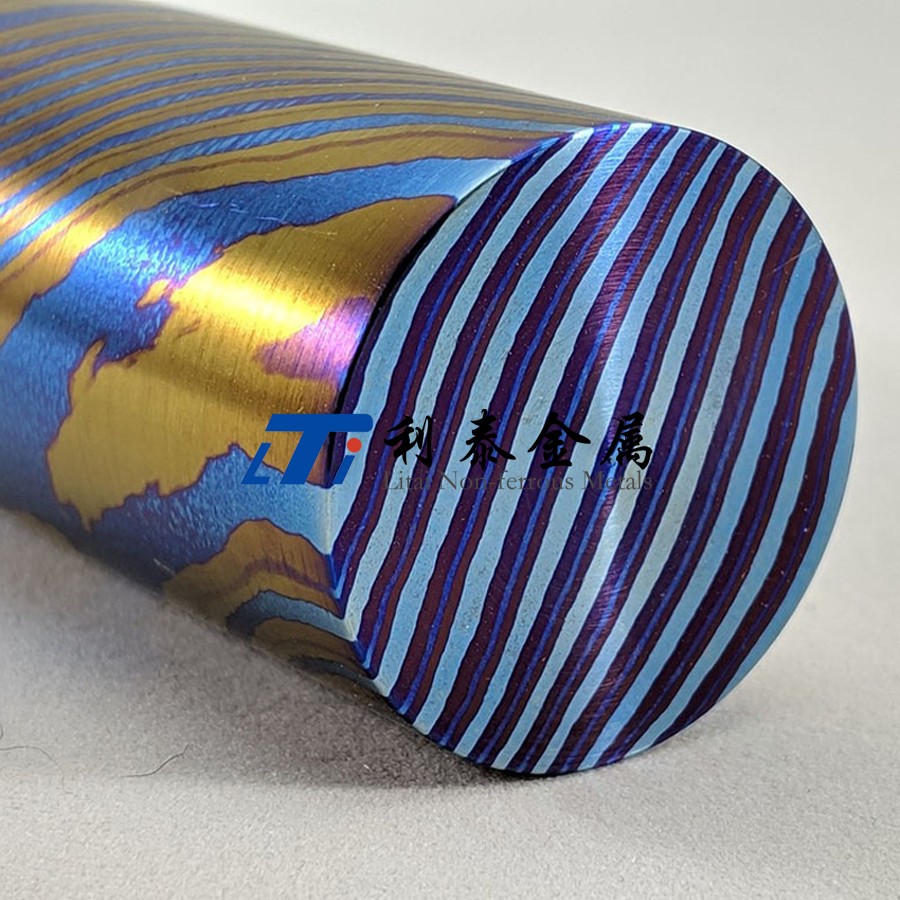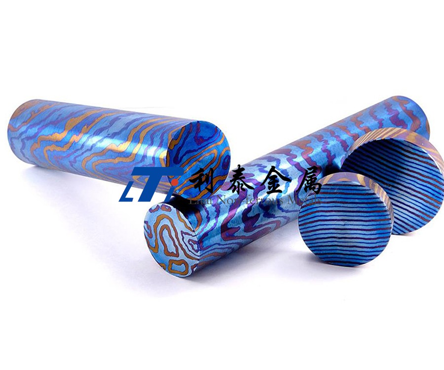 鈦馬士革是由兩種或兩種以上的鈦合金疊鍛而成。然后通過熱處理(鈦燒藍(lán))或者陽(yáng)極氧化,形成不同的顏色分層的鈦合金材質(zhì)。