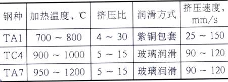 需要指出的是,鈦及鈦合金優(yōu)質(zhì)產(chǎn)品的擠壓,要求在保持工具有滿意壽命的條件下制定正確的生產(chǎn)工藝,即要求溫度、擠壓速度、擠壓比及潤滑方式的配合。上表列舉了典型鋼種擠壓棒材的參數(shù)。